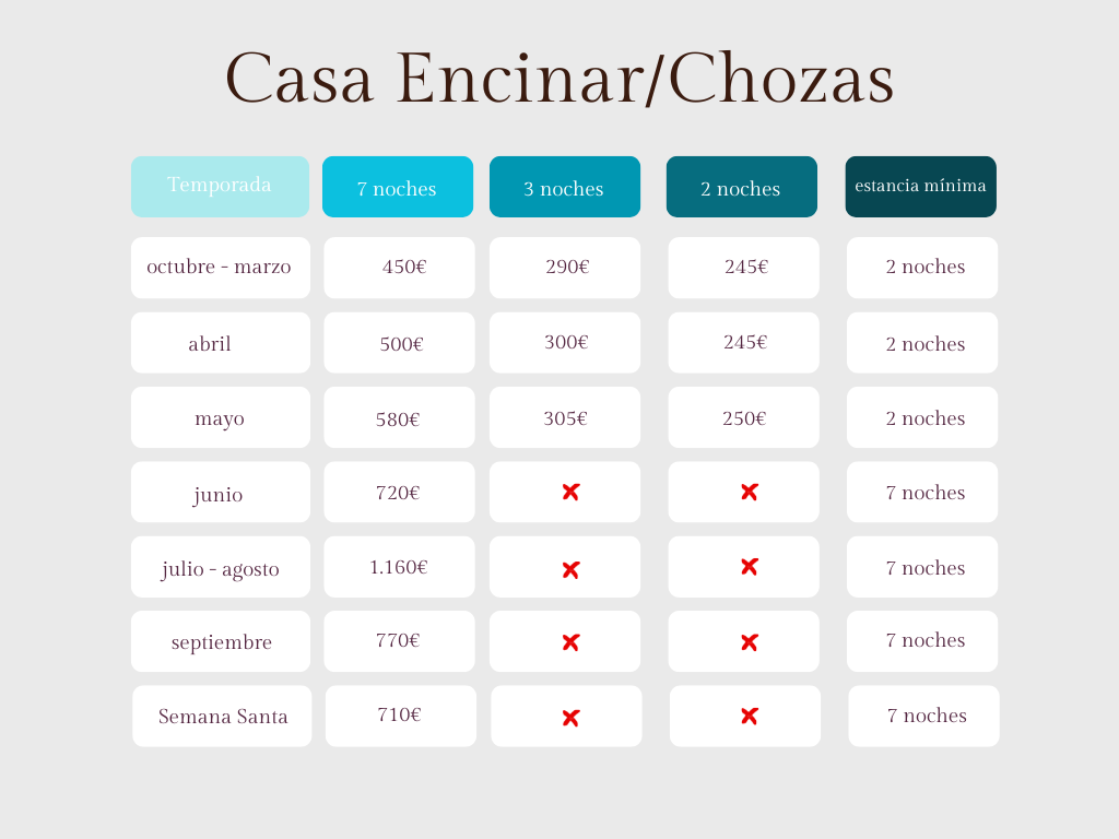 **Estos precios no son válidos para días festivos, puentes, Semana Santa, Navidad y Año Nuevo. Contáctanos para conocer la tarifa.